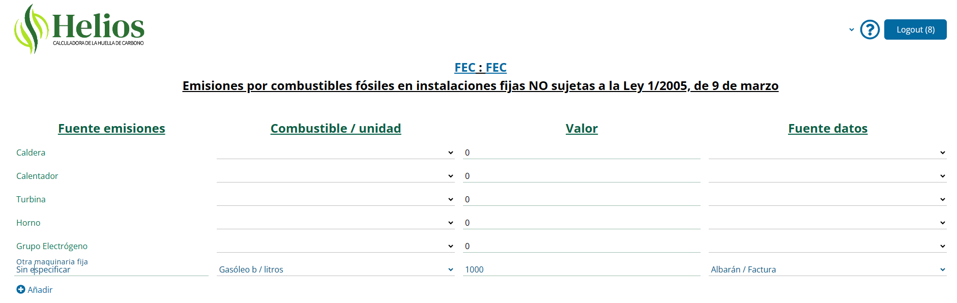 FUENTE DE EMISIONES: Para cada producto elegir uno o más combustibles (la electricidad es la última opción del desplegable).